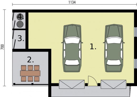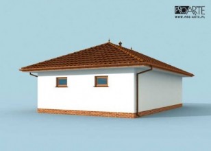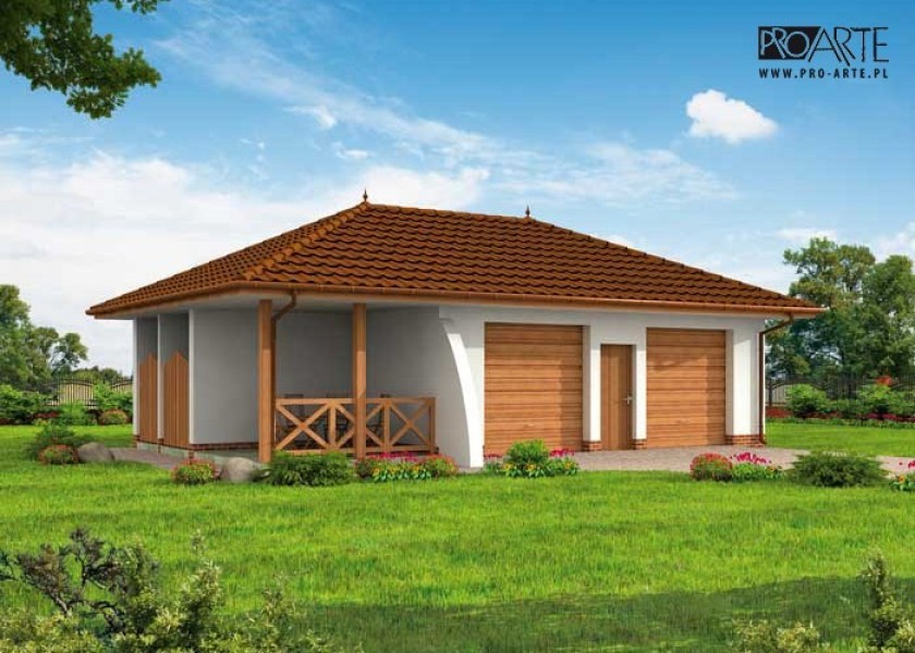 Garaż dwustanowiskowy z werandą, składem na drewno i odpady.Dwie bramy garażowe o wymiarach 2,4x2,4m.  Projekt garażu składa się z czterech egzemplarzy a w tym części architektonicznej, konstrukcyjnej i instalacji wewnętrznej elektrycznej. W projekcie załączone są podstawowe zestawienie stali, drewna i stolarki okienno-drzwiowej. Do projektu dołączamy bezpłatną zgodę na wprowadzenie zmian, oświadczenie projektantów o wykonaniu projektu zgodnie z obowiązującymi normami i przepisami oraz kserokopie uprawnień projektantów wraz z aktualnym wpisem do izby.