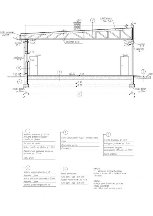 Garaż / magazyn- 1 stanowisko postojowe, 2 pomieszczenia gospodarcze, kotłownia, szatnia, łazienka.Brama garażowa o wymiarach 4,4x3,5m. Projekt garażu składa się z czterech egzemplarzy a w tym części architektonicznej, konstrukcyjnej i instalacji wewnętrznej elektrycznej. W projekcie załączone są podstawowe zestawienie stali, drewna i stolarki okienno-drzwiowej. Do projektu dołączamy bezpłatną zgodę na wprowadzenie zmian, oświadczenie projektantów o wykonaniu projektu zgodnie z obowiązującymi normami i przepisami oraz kserokopie uprawnień projektantów wraz z aktualnym wpisem do izby.