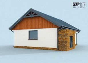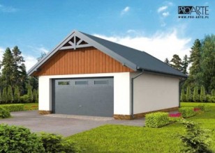 Garaż parterowy dwustanowiskowy z pomieszczeniem gospodarczym, z składem na drewno i odpady. Bramy garażowe o wymiarach otworu w murze 2400x5000. Projekt składa się z części architektonicznej, konstrukcyjnej i wewnętrznej instalacji elektrycznej. W projekcie załączone są podstawowe zestawienie stali, drewna i stolarki okienno-drzwiowej. Do projektu dołączamy bezpłatną zgodę na wprowadzenie zmian, oświadczenie projektantów o wykonaniu projektu zgodnie z obowiązującymi normami i przepisami oraz kserokopie uprawnień projektantów wraz z aktualnym wpisem do izby. W przypadku zamówienia projektu w technologii lekkiej, drewnianej konstrukcji szkieletowej, powierzchnia użytkowa budynku jest o około 7% większa.