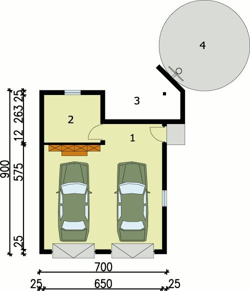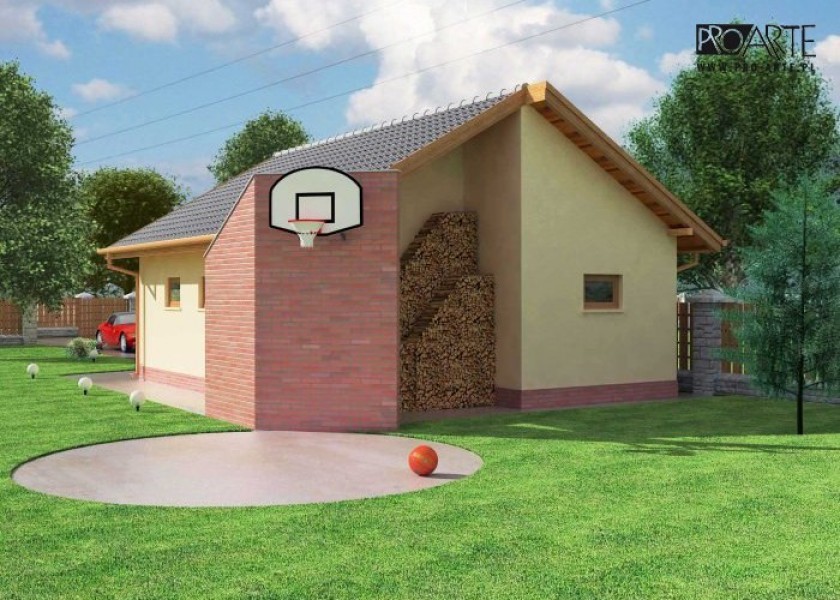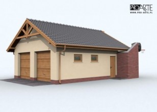 Garaż dwustanowiskowy z pomieszczeniem gospodarczym i składem na drewno kominkowe.