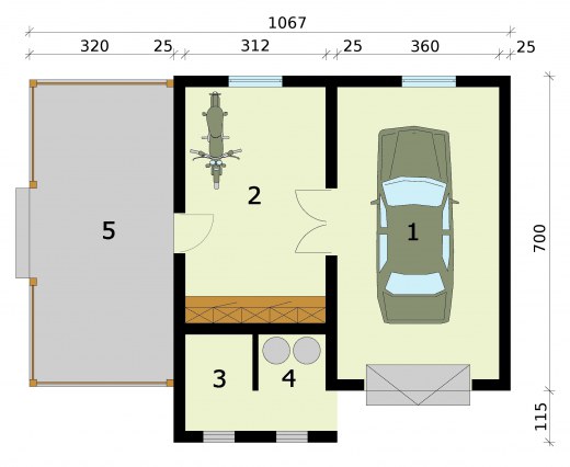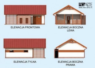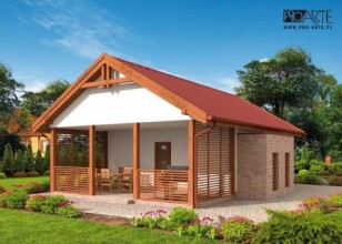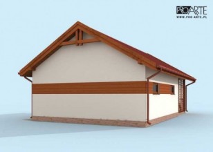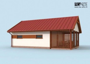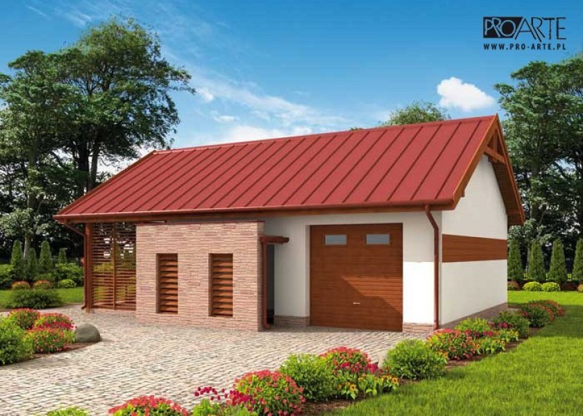 Budynek garażowy jednostanowiskowy z pomieszczeniem gospodarczym, werandą, składem na drewno i odpady. Projekt składa się z części architektonicznej, konstrukcyjnej i wewnętrznej instalacji elektrycznej. W projekcie załączone są podstawowe zestawienie stali, drewna i stolarki okienno-drzwiowej. Do projektu dołączamy bezpłatną zgodę na wprowadzenie zmian, oświadczenie projektantów o wykonaniu projektu zgodnie z obowiązującymi normami i przepisami oraz kserokopie uprawnień projektantów wraz z aktualnym wpisem do izby. W przypadku zamówienia projektu w technologii lekkiej, drewnianej konstrukcji szkieletowej, powierzchnia użytkowa budynku jest o około 7% większa.