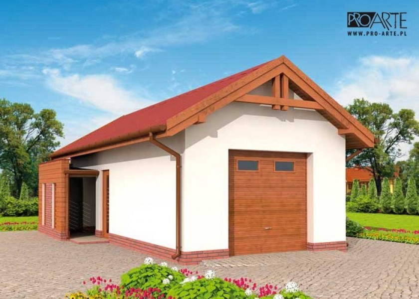 Garaż jednostanowiskowy z pomieszczeniem gospodarczym oraz składem na drewno i odpady.Brama garażowa o wymiarach 2,4x2,4m. Projekt garażu składa się z czterech egzemplarzy a w tym części architektonicznej, konstrukcyjnej i instalacji wewnętrznej elektrycznej. W projekcie załączone są podstawowe zestawienie stali, drewna i stolarki okienno-drzwiowej. Do projektu dołączamy bezpłatną zgodę na wprowadzenie zmian, oświadczenie projektantów o wykonaniu projektu zgodnie z obowiązującymi normami i przepisami oraz kserokopie uprawnień projektantów wraz z aktualnym wpisem do izby.