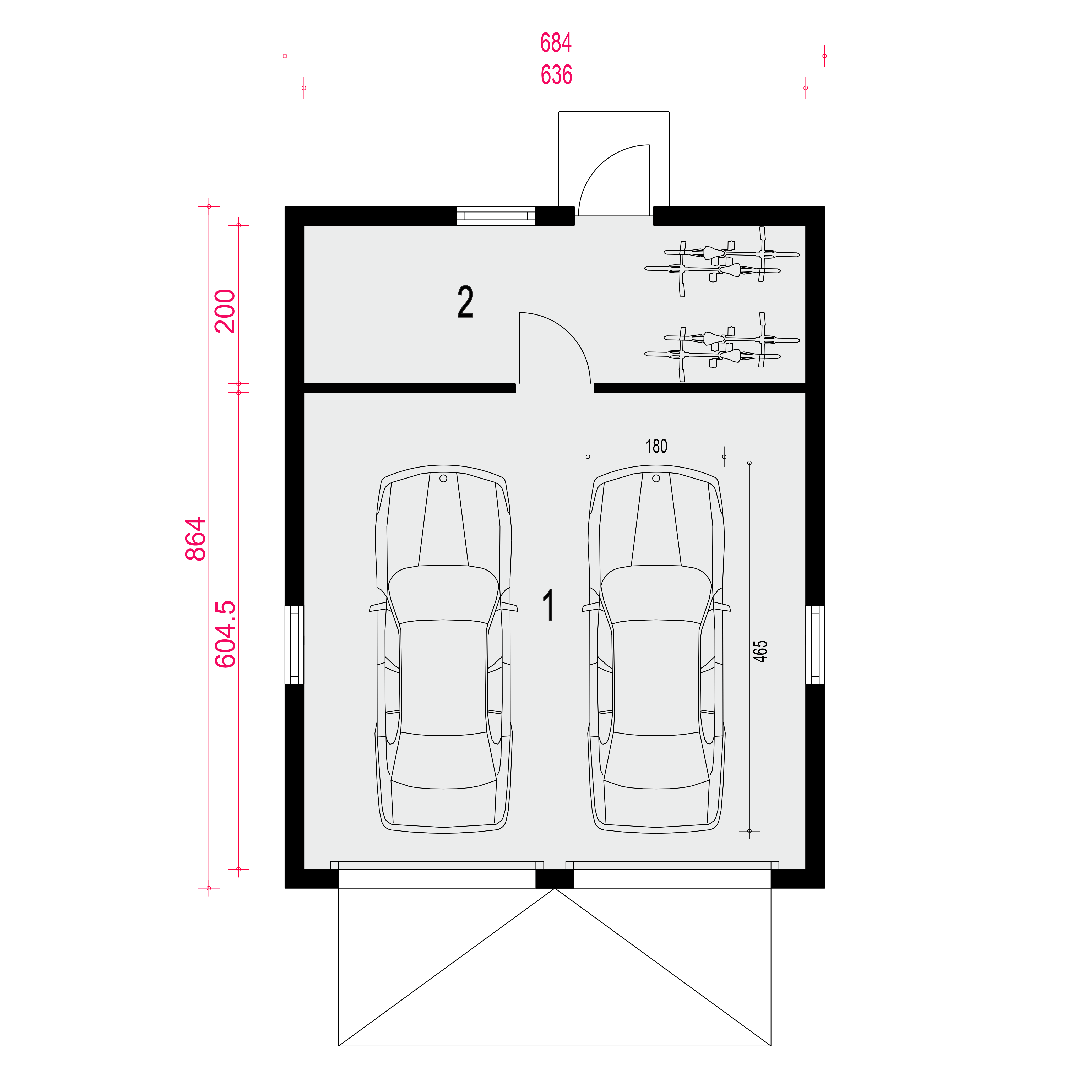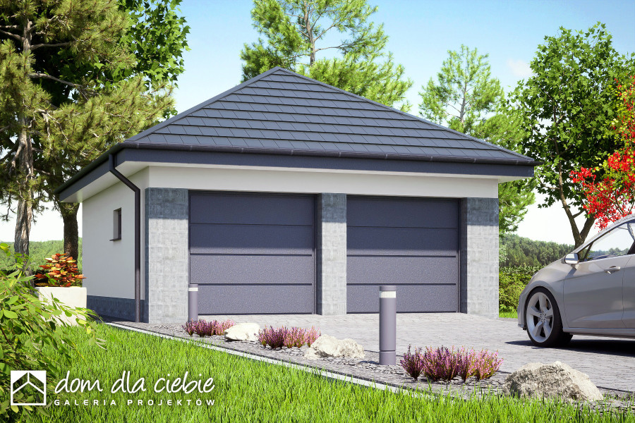 Wolnostojący garaż dwustanowiskowy z pomieszczeniem gospodarczym, zaprojektowany w technologii murowanej z dachem o konstrukcji drewnianej pokrytym dachówką ceramiczną, cementową lub blachodachówką. Wysokość użytkowa 2,6 cm. Bramy wjazdowe o wym. 2,6 m x 2,25 m. Wykończenia: tynk akrylowy, podmurówka tynk mozaikowy.