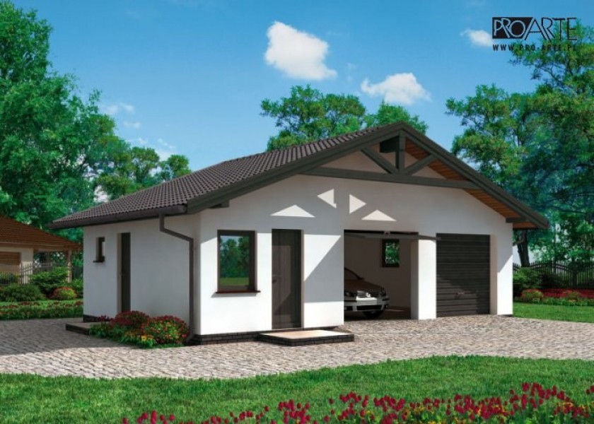 Garaż dwystanowiskowy w technologii szkieletowej, wolnostojący, parterowy. Brama garażowa o wymiarach 2400x2200. Garaż posiada dodatkowe 2 pomieszczenia gospodarcze.Zobacz garaż w wersjii murowanej. Projekt garażu składa się z czterech egzemplarzy a w tym części architektonicznej, konstrukcyjnej i instalacji wewnętrznej elektrycznej. W projekcie załączone są podstawowe zestawienie stali, drewna i stolarki okienno-drzwiowej. Do projektu dołączamy bezpłatną zgodę na wprowadzenie zmian, oświadczenie projektantów o wykonaniu projektu zgodnie z obowiązującymi normami i przepisami oraz kserokopie uprawnień projektantów wraz z aktualnym wpisem do izby.