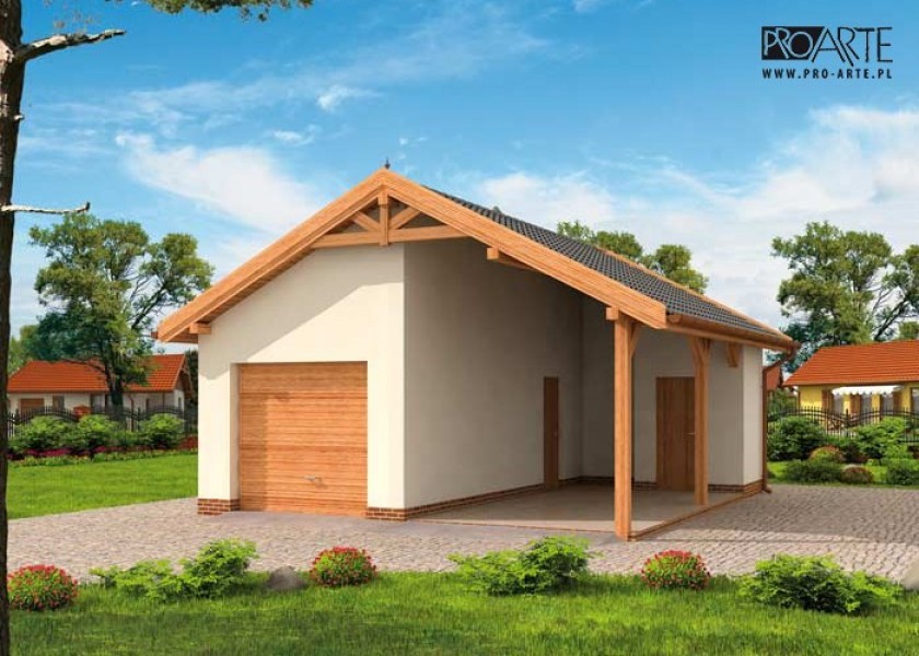 Garaż z wiatą na samochód osobowy oraz pomieszczenie gospodarcze.Brama garażowa o wymiarach 2,4x2,4m,Projekt garażu składa się z czterech egzemplarzy a w tym części architektonicznej, konstrukcyjnej i instalacji wewnętrznej elektrycznej. W projekcie załączone są podstawowe zestawienie stali, drewna i stolarki okienno-drzwiowej. Do projektu dołączamy bezpłatną zgodę na wprowadzenie zmian, oświadczenie projektantów o wykonaniu projektu zgodnie z obowiązującymi normami i przepisami oraz kserokopie uprawnień projektantów wraz z aktualnym wpisem do izby.