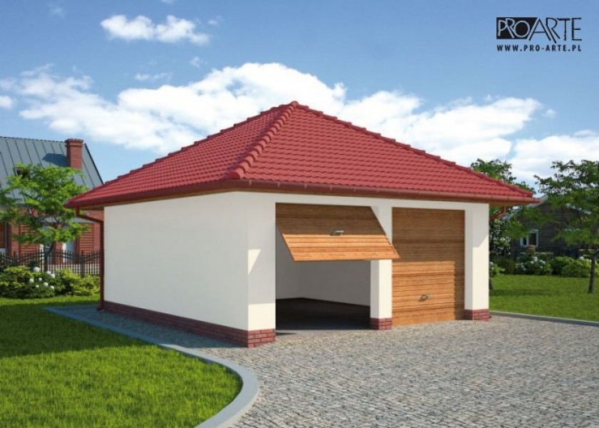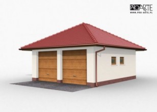 Garaż dwustanowiskowy w technologii szkieletowej, wolnostojący. Brama garażowa o wymiarach 2400x2400. Zobacz garaż w wersjii murowanej.Projekt garażu składa się z czterech egzemplarzy a w tym części architektonicznej, konstrukcyjnej i instalacji wewnętrznej elektrycznej. W projekcie załączone są podstawowe zestawienie stali, drewna i stolarki okienno-drzwiowej. Do projektu dołączamy bezpłatną zgodę na wprowadzenie zmian, oświadczenie projektantów o wykonaniu projektu zgodnie z obowiązującymi normami i przepisami oraz kserokopie uprawnień projektantów wraz z aktualnym wpisem do izby.