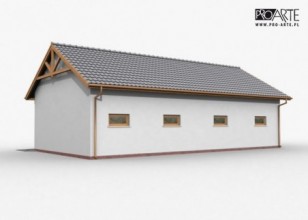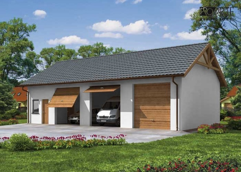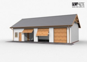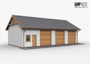 Garaż trzystanowiskowy z dwoma pomieszczeniami gospodarczymi w technologii szkieletowej, wolnostojący, parterowy. Budynek posiada trzy bramy garażową o wymiarach 3,0 x 3,0m.Zobacz garaż w wersjii murowanej.Projekt garażu składa się z czterech egzemplarzy a w tym części architektonicznej, konstrukcyjnej i instalacji wewnętrznej elektrycznej. W projekcie załączone są podstawowe zestawienie stali, drewna i stolarki okienno-drzwiowej. Do projektu dołączamy bezpłatną zgodę na wprowadzenie zmian, oświadczenie projektantów o wykonaniu projektu zgodnie z obowiązującymi normami i przepisami oraz kserokopie uprawnień projektantów wraz z aktualnym wpisem do izby.