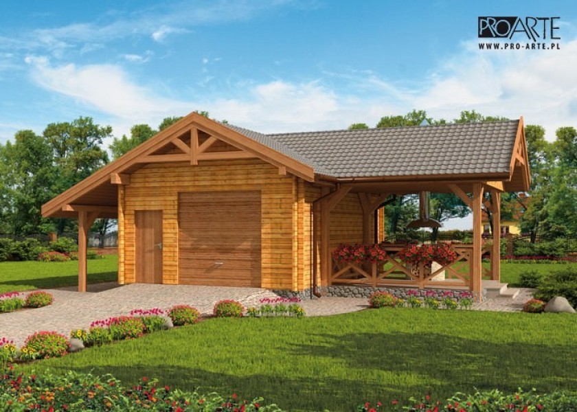 Projekt garażu jednostanowiskowego z pom. gospodarczym, składem na drewno i altaną ogrodową z bala drewnianego. Ciekawym i funkcjonalnym rozwiazaniem są garaże wykonane z bali. Ta technologia zyskuje uznanie w coraz szerszych kręgach inwestorów. Jest to rozwiązanie łączące tradycję oraz nowoczesność. Znakomitym przykładem garażu z bali jest projekt G53, który wyposażony jest ponadto w zadaszenie, altanę z grillem i wędzarnikiem. Dzięki takim urozmaiceniom, wspaniale rozszerza swoje funkcje, altana jest miejscem wypoczynku i rodzinnych spotkań od wiosny do jesieni. Projekt budynku składa się z 6 egzemplarzy, a w tym 3 tomów części architektoniczno-budowlanej oraz 3 technicznej. W projekcie załączone są podstawowe zestawienie stali, drewna i stolarki okienno-drzwiowej. Do projektu dołączamy bezpłatną zgodę na wprowadzenie zmian, oświadczenie projektantów o wykonaniu projektu zgodnie z obowiązującymi normami i przepisami oraz kserokopie uprawnień projektantów wraz z aktualnym wpisem do izby. W przypadku zamówienia projektu w technologii lekkiej, drewnianej konstrukcji szkieletowej, powierzchnia użytkowa budynku jest o około 7% większa.