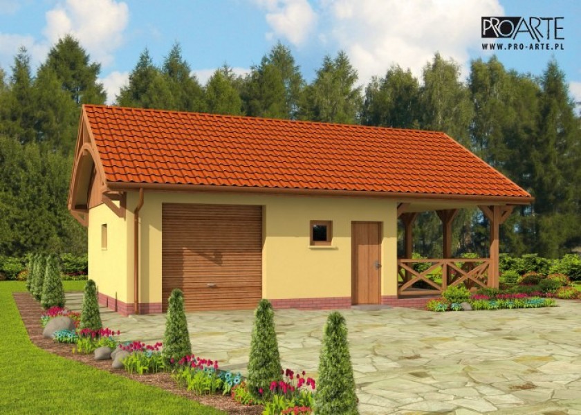 G56 szkielet drewiany garaż jednostanowiskowy z pomieszczeniem gospodarczym, wiatą
