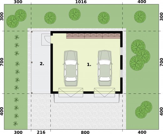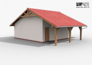 Garaż dwustanowiskowy z wiatą, wolnostojący, parterowy. Brama garażowa o wymiarach 2800x3000 i 2400x2200.
