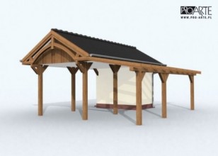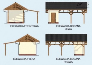 Wiata dwustanowiskowa z pomieszczeniem gospodarczym w technologii szkieletowej, wolnostojący, parterowy. Zobacz garaż w wersjii murowanej.Projekt garażu składa się z czterech egzemplarzy a w tym części architektonicznej, konstrukcyjnej i instalacji wewnętrznej elektrycznej. W projekcie załączone są podstawowe zestawienie stali, drewna i stolarki okienno-drzwiowej. Do projektu dołączamy bezpłatną zgodę na wprowadzenie zmian, oświadczenie projektantów o wykonaniu projektu zgodnie z obowiązującymi normami i przepisami oraz kserokopie uprawnień projektantów wraz z aktualnym wpisem do izby.