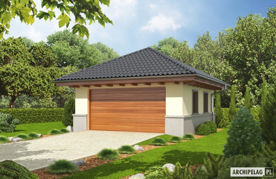 Garaż G18 pochodzący z pracowni architektonicznej Archipelag to propozycja dla tych inwestorów, którzy w swoim projekcie domu nie posiadają wkomponowanego w bryłę garażu lub potrzebują jeszcze więcej miejsca na samochody niż oferuje im to wybrany przez nich dom. W tym przypadku do dyspozycji klientów jest przestrzeń na aż dwa auta. Sama powierzchnia użytkowa to dokładnie 32,9 m kw i jedno kryjące się wewnątrz pomieszczenie. Garaż G18, dzięki swojej doskonale skomponowanej, eleganckiej elewacji, będzie pasował do budynków zarówno nowoczesnych, jak i tych tradycyjnych stylowo. Sam wygląd tej konstrukcji jest harmonijny i klasyczny. Jasnożółty i szary tynk połączono ze sobą, co daje delikatny, nieprzytłaczający efekt, a i spore urozmaicenie w porównaniu z wersjami jednokolorowymi. Do tego