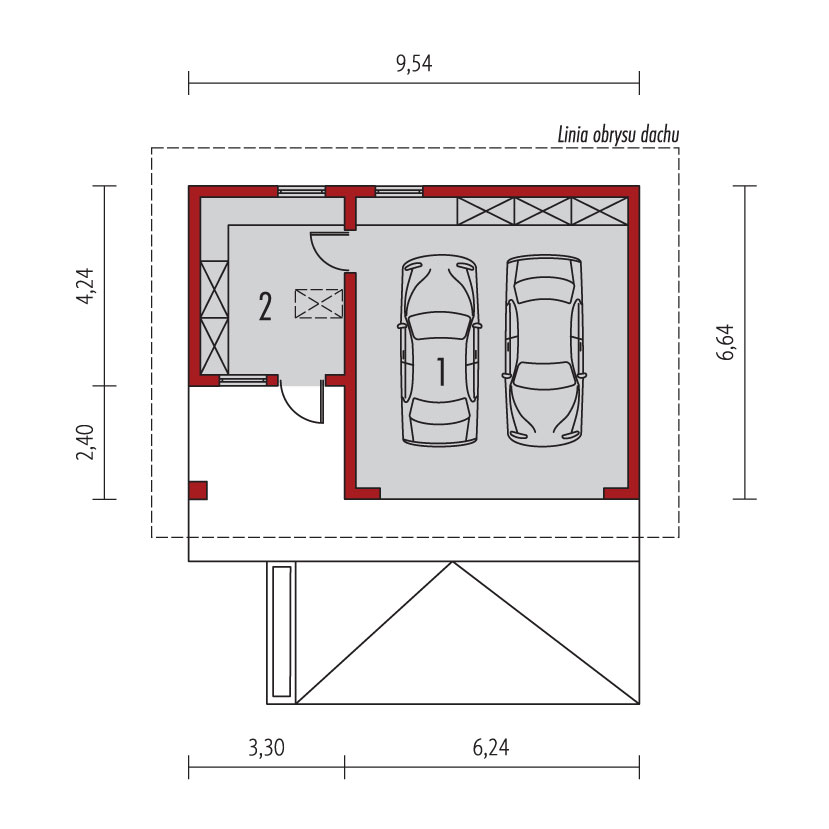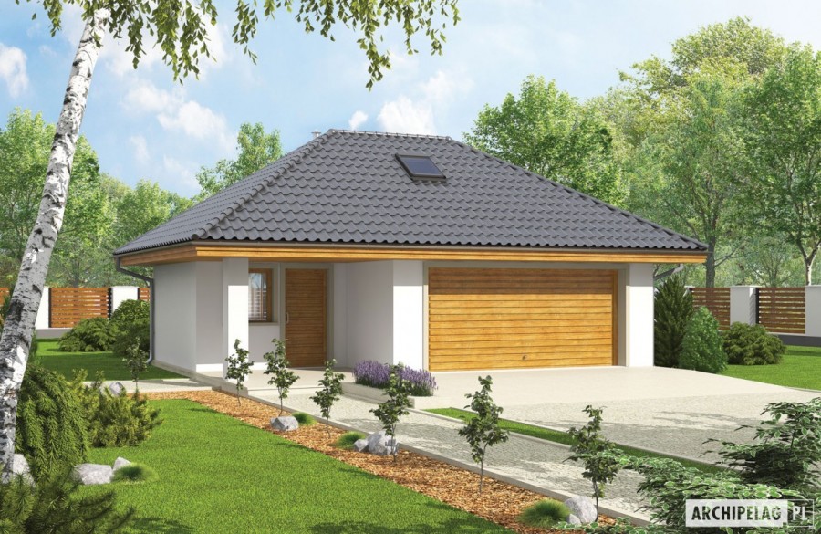 Charakterystyka: Garaż dwustanowiskowy z pomieszczeniem gospodarczym i strychemTechnologia i konstrukcja: Ściany zewnętrzne i zewnętrzne: murowane, cegła wapienno-piaskowa Strop: drewniany Dach: konstrukcja drewniana, dachówka ceramiczna, np. firmy Röben, więźba dachowa dostępna również w systemie prefabrykacji drewnianej Inne: wyłaz na strychWykończenie: Elewacje: tynk mineralny gładki Stolarka: drewniana lub PCV Otoczenie: kostka betonowa firmy LibetDostępne wersje: - odbicie lustrzane