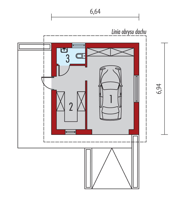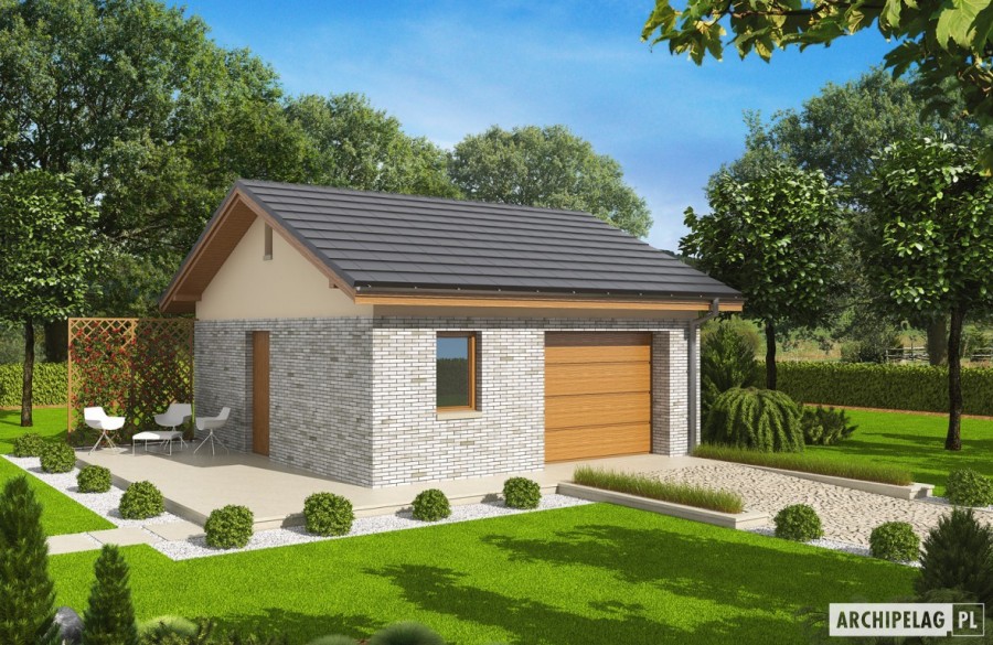 Charakterystyka: Garaż jednostanowiskowy z pomieszczeniem gospodarczym i toaletąTechnologia i konstrukcja: Ściany zewnętrzne: murowane, cegła wapienno-piaskowa 24 cm, ocieplenie styropian Termo Organika 20 cm Ściany wewnętrzne: murowane, cegła wapienno-piaskowa 12 cm Strop: drewniany ocieplony Dach: konstrukcja drewniana, dachówka ceramiczna, np. firmy Röben, więźba dachowa dostępna również w systemie prefabrykacji drewnianejWykończenie: Elewacje: tynk mineralny i okładzina z płytek klinkierowych Stolarka: drewniana lub PCVDostępne wersje: - odbicie lustrzaneIstnieje możliwość: - dostawienia bryły garażu do budynku mieszkalnego - wykonania budynku w technologii szkieletowej