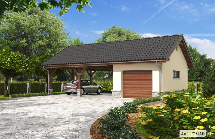 Charakterystyka: Garaż jednostanowiskowy z wiatą dwustanowiskowąTechnologia i konstrukcja: Ściany zewnętrzne: murowane, bloczki keramzytobetonowe Box Term 24 cm Strop: drewniany Dach: konstrukcja drewniana, blachodachówka, więźba dachowa dostępna również w systemie prefabrykacji drewnianejWykończenie: Elewacje: tynk mineralny, cokół okładzina klinkierowa Stolarka: drewniana lub PCVDostępne wersje: - odbicie lustrzane Istnieje możliwość: - dostawienia bryły garażu do budynku mieszkalnego - wykonania budynku w technologii szkieletowej