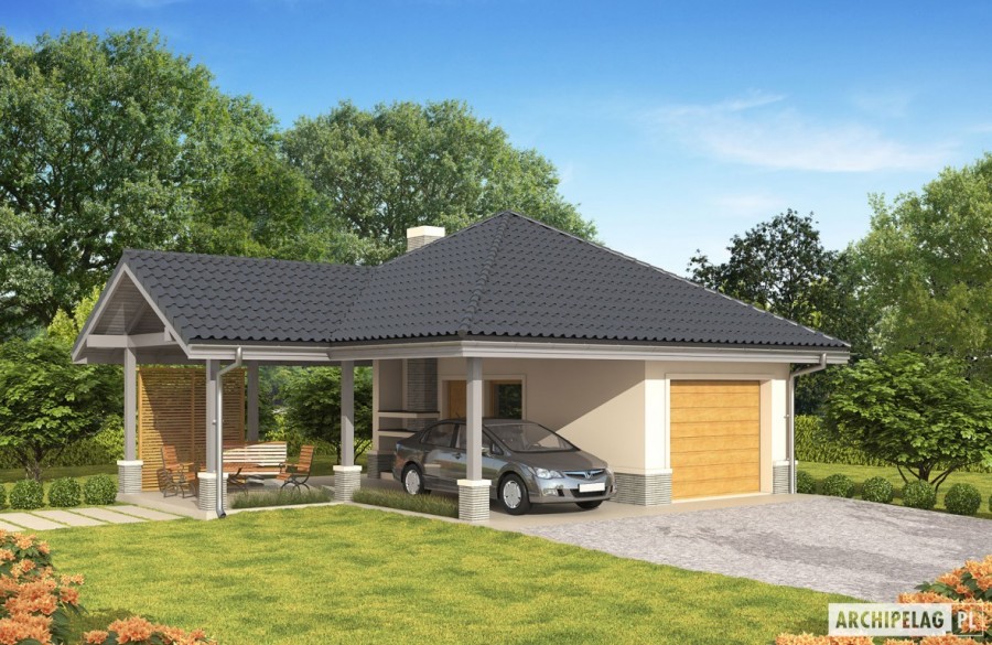 Charakterystyka: Garaż jednostanowiskowy z wiatą na samochód, grillem i przestrzenią rekreacyjnąTechnologia i konstrukcja: Ściany zewnętrzne: murowane, jednowarstwowe, cegła wapienno-piaskowa 24 cm Strop: drewniany Dach: konstrukcja drewniana, dachówka ceramiczna firmy Röben, więźba dachowa dostępna również w systemie prefabrykacji drewnianejWykończenie: Elewacje: tynk cienkowarstwowy mineralny w kolorze kremowym, płytki klinkierowe Stolarka: drewniana lub PVC Wersje -zapytaj o dostępność: - Budynek gospodarczy G25 – pomieszczenie gospodarcze z wiatą, grillem i przestrzenią rekreacyjną - Garaż G25 w. III – garaż dwustanowiskowy z grillem i przestrzenią rekreacyjną - Garaż G25 w. IV – garaż dwustanowiskowy z wiatą samochodową, grillem i przestrzenią rekreacyjną - odbicie lustrzane do każdej wersjiIstnieje techniczna możliwość: - podpiwniczenia budynku - wykonania budynku w technologii szkieletowej - wykonania zmian wg indywidualnych preferencji Inwestora
