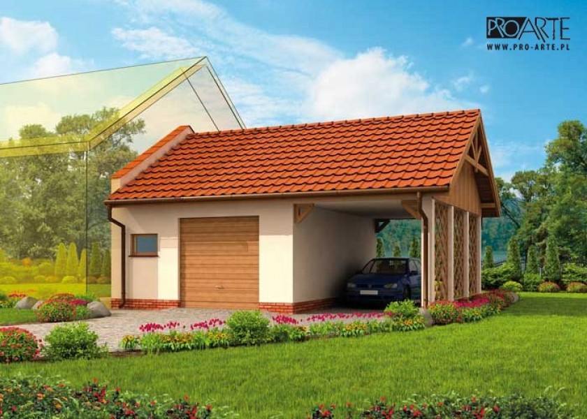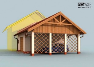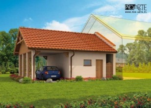 Garaż jednostanowiskowy dostawiany z pomieszczeniem gospodarczym i wiatą.Brama garażowa o wymiarach 2,4x2,4m. Projekt garażu składa się z czterech egzemplarzy a w tym części architektonicznej, konstrukcyjnej i instalacji wewnętrznej elektrycznej. W projekcie załączone są podstawowe zestawienie stali, drewna i stolarki okienno-drzwiowej. Do projektu dołączamy bezpłatną zgodę na wprowadzenie zmian, oświadczenie projektantów o wykonaniu projektu zgodnie z obowiązującymi normami i przepisami oraz kserokopie uprawnień projektantów wraz z aktualnym wpisem do izby.
