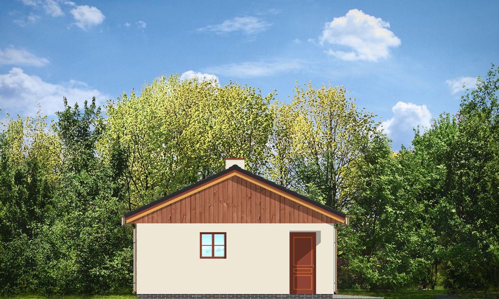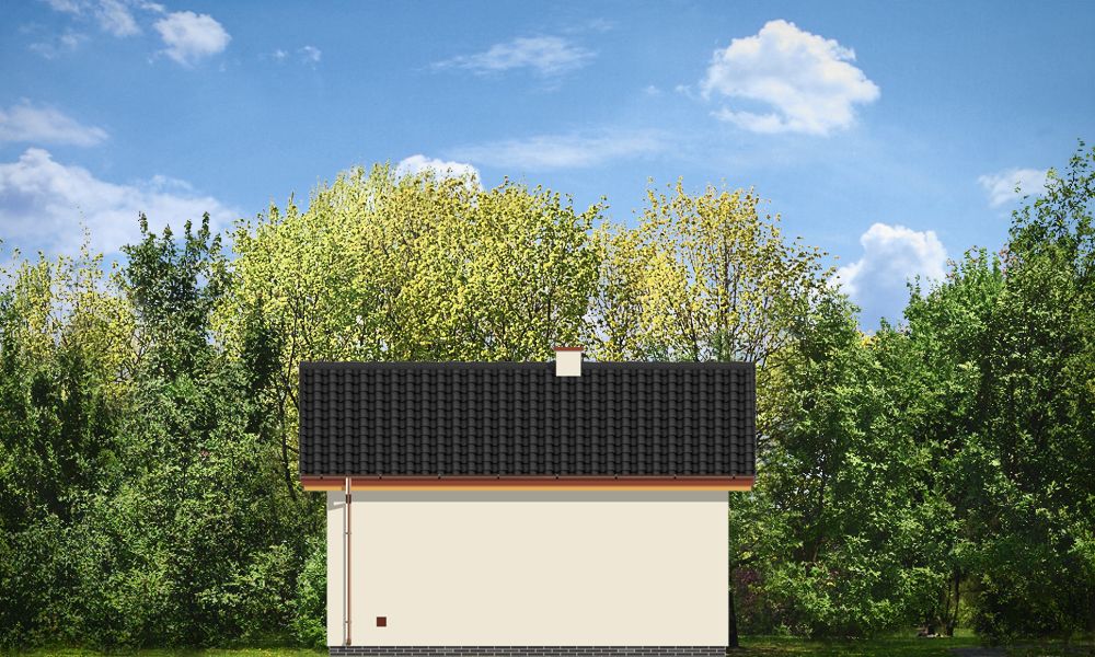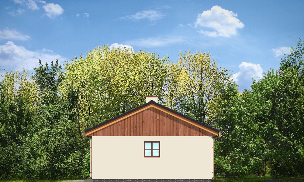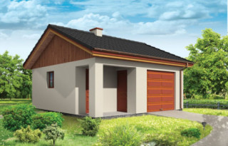 Garaż jednostanowiskowy z pomieszczeniem gospodarczym z dodatkowym wyjściem od strony elewacji bocznej oraz frontowej (dostępny również jako budynek gospodarczy) przykryty dachem dwuspadowym.