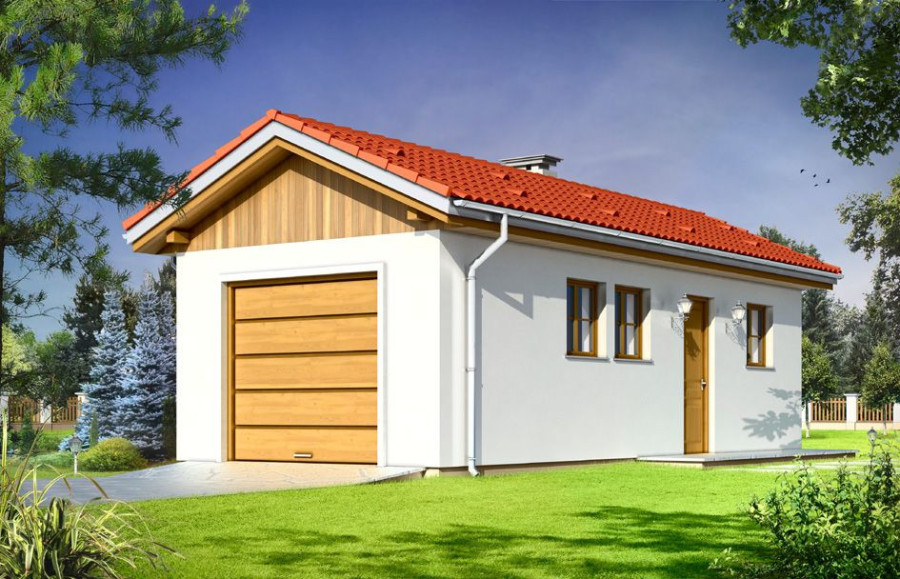 Garaż jednostanowiskowy z pomieszczeniem gospodarczym z tyłu (dostępny również jako budynek gospodarczy) przykryty dachem dwuspadowym z dodatkowym wyjściem od strony elewacji bocznej.