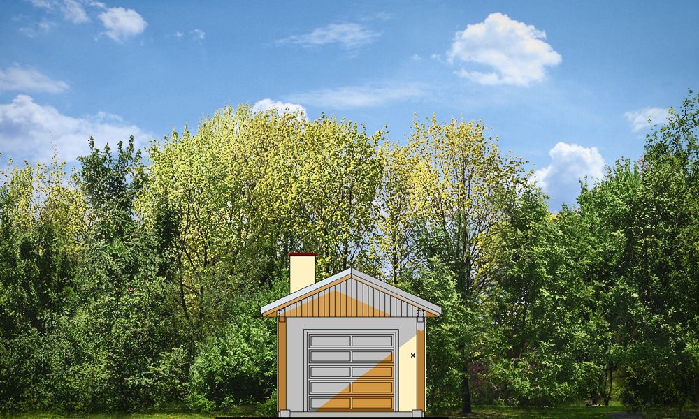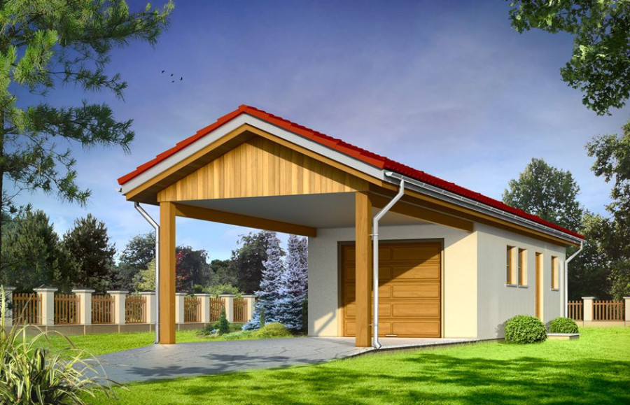 Garaż jednostanowiskowy z pomieszczeniem gospodarczym z tyłu (dostępny również jako budynek gospodarczy) przykryty dachem dwuspadowym z dodatkowym wyjściem od strony elewacji bocznej oraz z wiatą od frontu pełniącą funkcję dodatkowego stanowiska parkingowego.