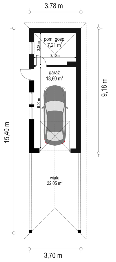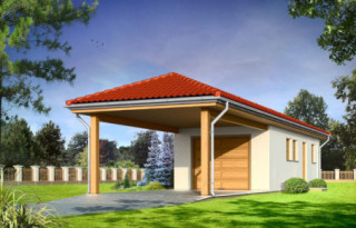 Garaż jednostanowiskowy z pomieszczeniem gospodarczym z tyłu (dostępny również jako budynek gospodarczy) przykryty dachem wielospadowym z dodatkowym wyjściem od strony elewacji bocznej oraz z wiatą od frontu pełniącą funkcję dodatkowego stanowiska parkingowego.