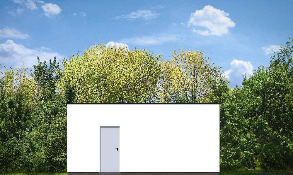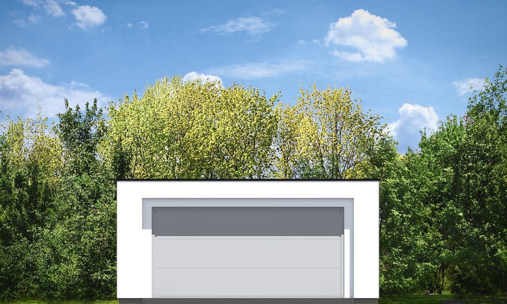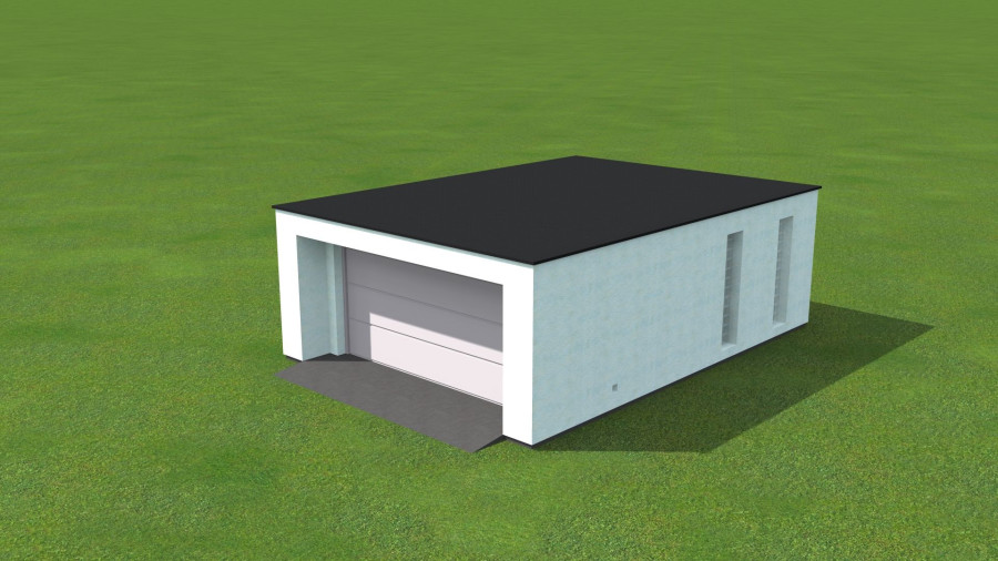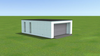 Garaż dwustanowiskowy przykryty dachem płaskim z dodatkowym pomieszczeniem gospodarczym za garażem z osobnym wyjściem od strony elewacji tylnej.