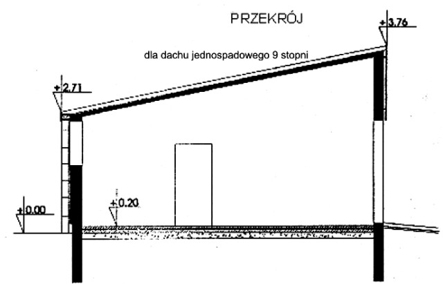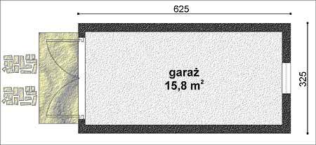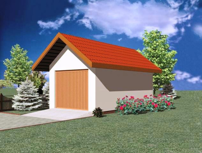 Budynek garażowy jednostanowiskowyŚciany zewnętrzne: gr. 25 cm z pustaków PGS lub cegły ceramicznej; dach: jedno lub dwuspadowy o nachyleniu 35 stopni (dla jednospadowego 9 stopni), więźba krokwiowa, krycie dachówką (jednospadowy papą)