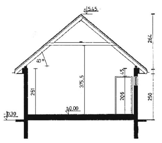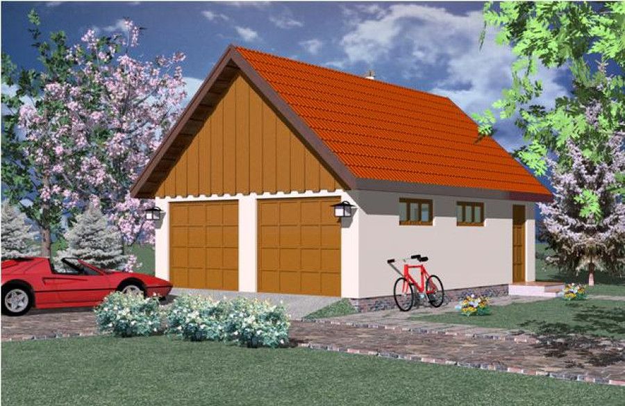 Budynek garażowy dwustanowiskowyŚciany zewnętrzne: gr. 20 cm z pustaków żużlo-betonowych; dach: dwu i czterospadowy, o nachyleniu 40 stopni, więźba krokwiowo-jętkowa, krycie blachą głęboko tłoczoną powlekaną lub dachówką