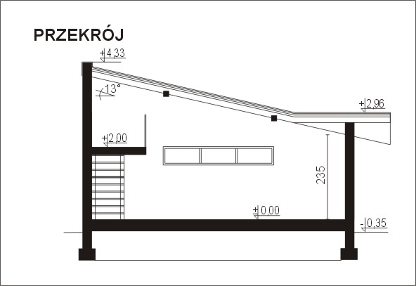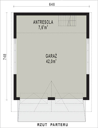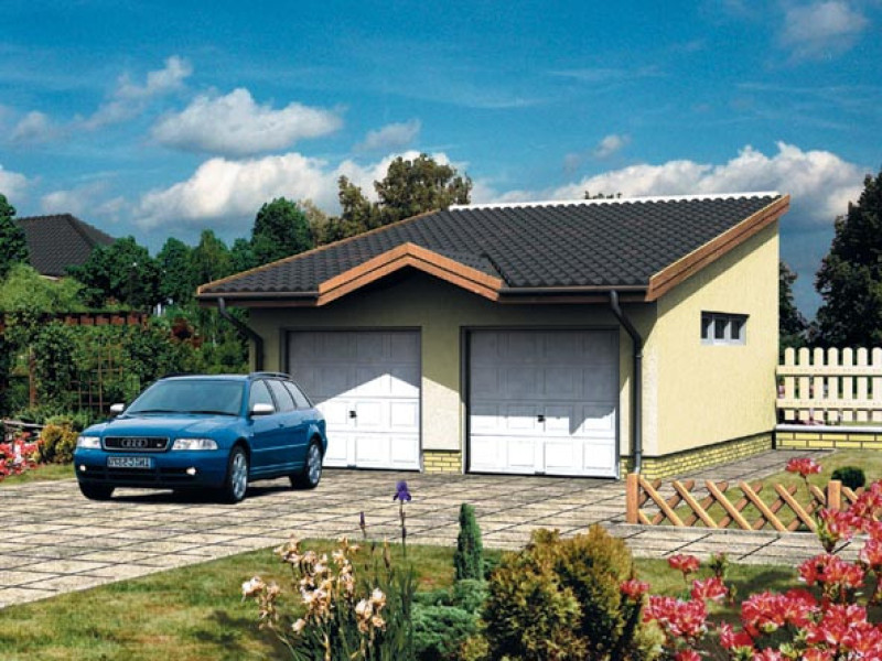 Budynek gara¿owy dwustanowiskowy, parterowy z antresol¹, niepodpiwniczony o dachu jednospadowym, i kącie nachylenia 13 stopni, wiêżba dachowa drewniana.Ściany zewnętrzne: Bloczi YTPNG lub PGS grubości 24 cm; dach: jednospadowy o nachyleniu 13 stopni, kryty dachówka ceramiczną