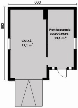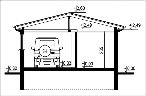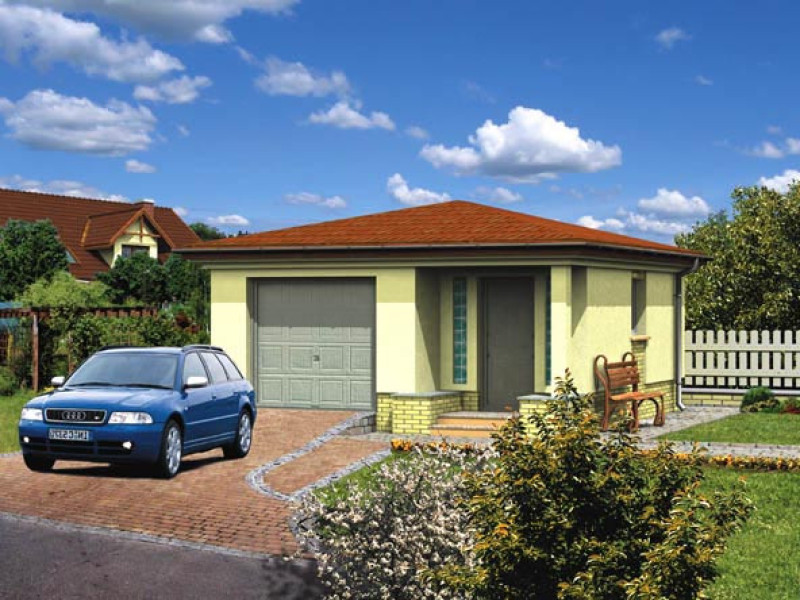 Budynek garażowy jednostanowiskowy z pomieszczeniem gospodarczymŚciany zewnętrzne: gr. 24cm z bloczków z betonu komórkowego; dach: czterospadowy o kacie nachylenia 14 stopni, krycie gontem papowym