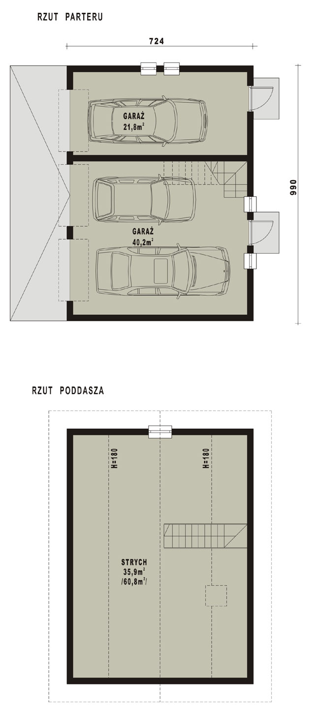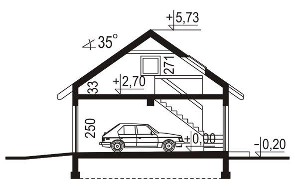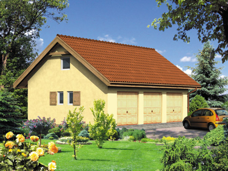 Budynek garażowy trzystanowiskowyStrop: gr. 24 cm z bloczków SILKA; dach: dwuspadowy o nachyleniu 35 stopni, krycie dachówką