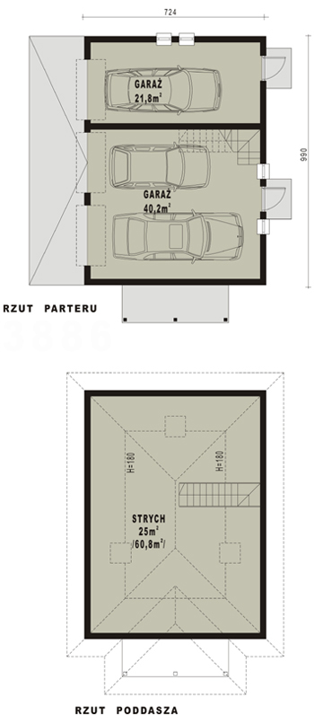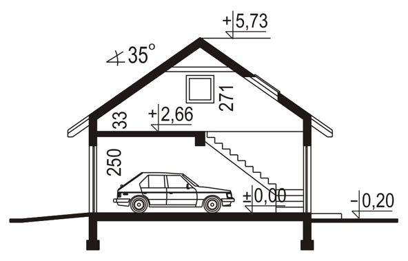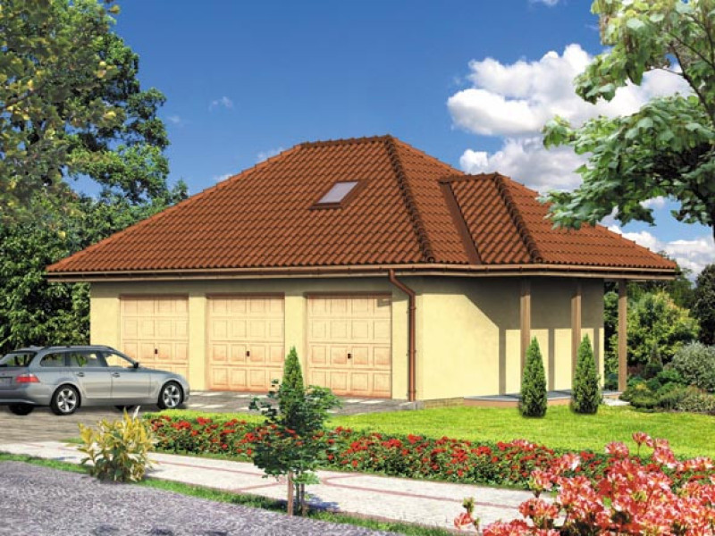 Budynek garażowy trzystanowiskowyŚciany zewnętrzne: gr. 24 cm z bloczków SILKA; dach: czterospadowy o nachyleniu 35 stopni, krycie dachówką