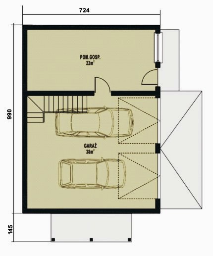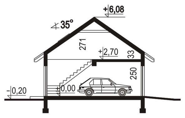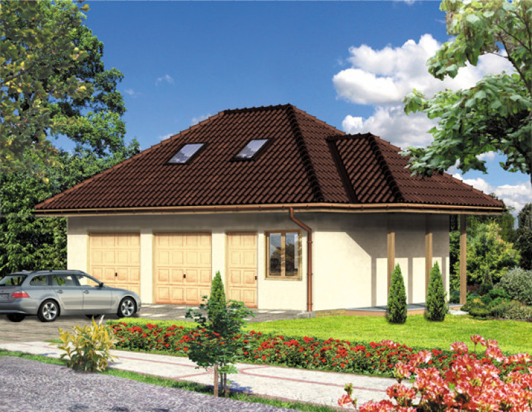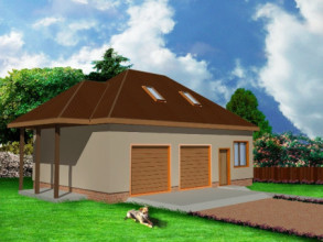 Budynek garażowy dwustanowiskowy z pomieszczeniem gospodarczym i poddaszem do zagospodarowaniaŚciany zewnętrzne: gr. 24 cm z bloczków SILKA; strop: żelbetowy; schody: drewniane; dach: czterospadowy o nachyleniu 35 stopni, krycie dachówką