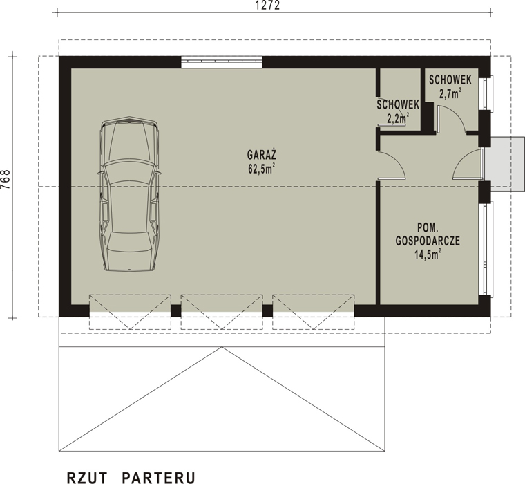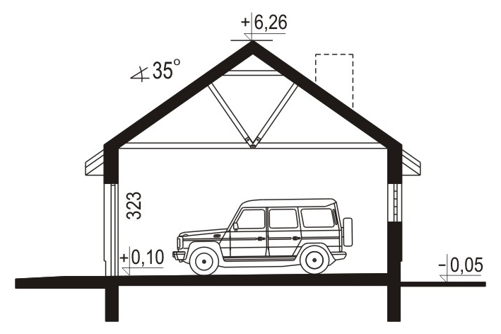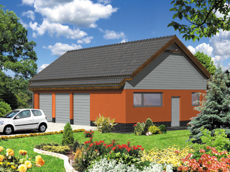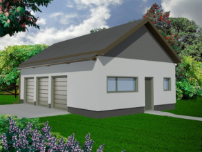 Budynek garażowy trzystanowiskowyŚciany zewnętrzne: gr. 36 cm z bloczków gazobetonowych + wełna mineralna; dach: dwuspadowy o nachyleniu 35 stopni, kryty blachą dachówkopodobną