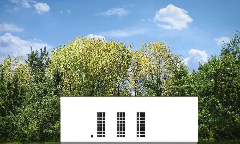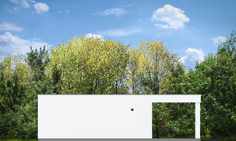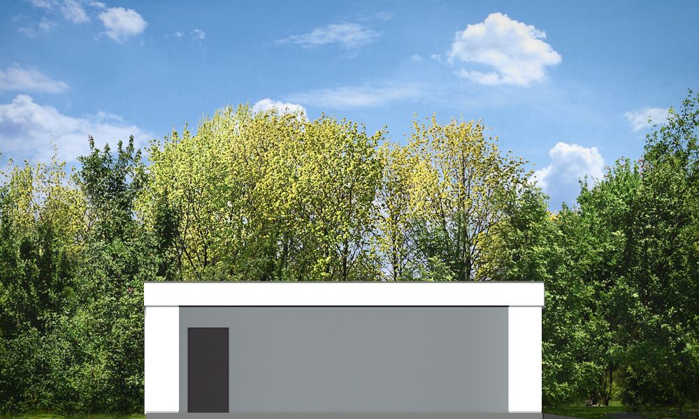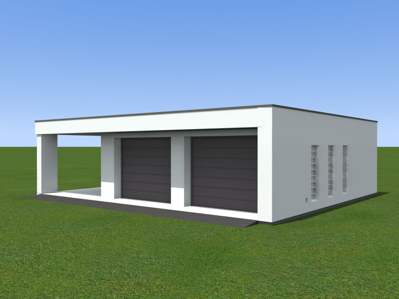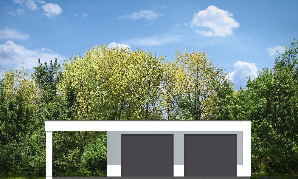 Garaż dwustanowiskowy przykryty płaskim dachem z dodatkowym stanowiskiem pod wiatą.