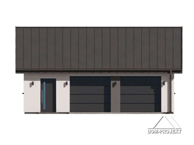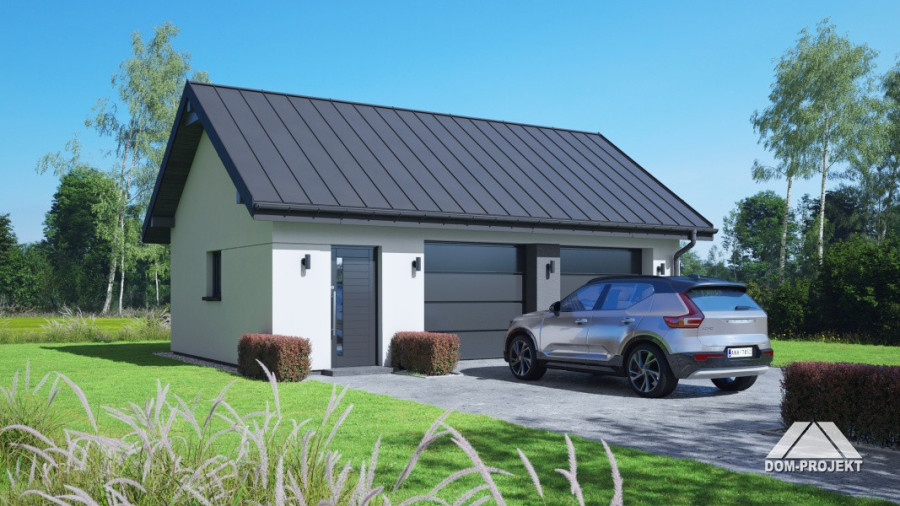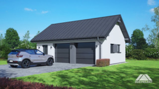 Projekt prostego i praktycznego garażu wolnostojącego. Zmieści dwa samochody. Prosta bryła budynku oraz dach dwuspadowy sprzyjają szybkiej i taniej budowie, obniżają koszty eksploatacji oraz sprawiają, że budynek idealnie wpasuje się w każdą działkę.