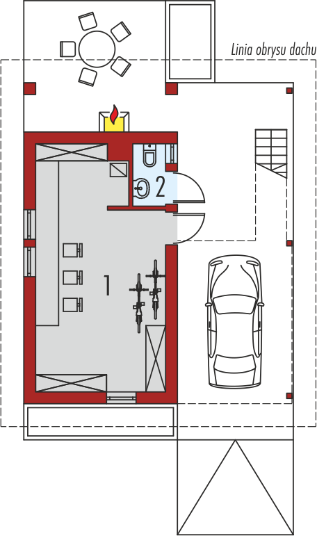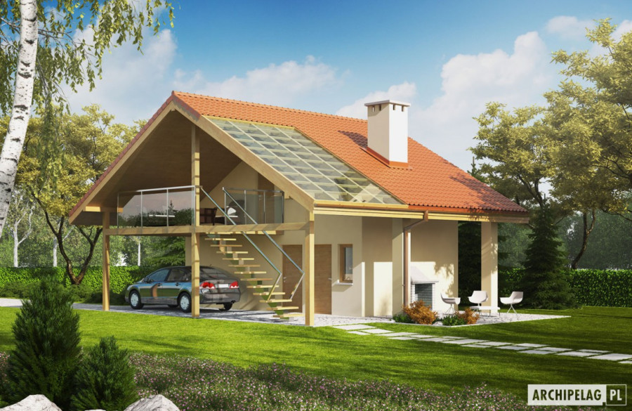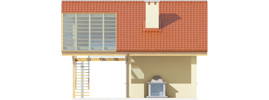 Budynek gospodarczy z wiatą oraz pracownią na poddaszu. Na parterze zaprojektowano pomieszczenie gospodarcze oraz toaletę dostępną z zewnątrz. Z boku budynku zlokalizowano wiatę na jeden samochód, natomiast w dalszej części zaplanowano strefę wypoczynkową w postaci tarasu z grillem. W przestrzeni poddasza, na które prowadzą schody zewnętrzne znajduje się pracownia oraz łazienka.Budynek G35 wyróżnia się swoją architekturą i wygodnie rozplanowanym podziałem stref. Z myślą o miłośnikach wypoczynku na świeżym powietrzu, zaplanowano atrakcyjne strefy relaksu, zlokalizowane na antresoli oraz na tarasie. Bryła budynku harmonijnie skomponuje się m.in. z domem Eryk, Erin, Tori, Rafael oraz Karmela. Budynek G35 z sukcesem odnajdzie się również w roli funkcjonalnego domku letniskowego.