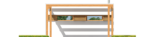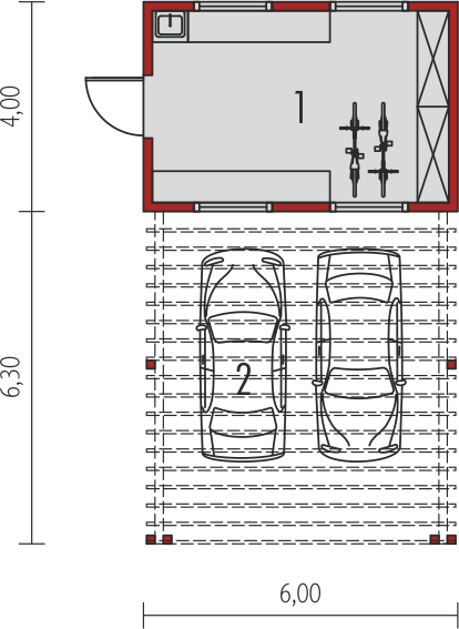 Charakterystyka: Budynek gospodarczy z wiatąTechnologia i konstrukcja:Fundamenty: ławy, bloczki betonowe 20 cmŚciany zewnętrzne: technologia szkieletowa, ściany 17 cm, ocieplenie 14,5 cmPodłoga na gruncie: płyta betonowa 20 cmDach: stropodach drewniany, belka 20 cmWykończenie:Elewacja: tynk cienkowarstwowy mineralny, drewniane ozdobne okienniceStolarka: drewniana lub PCVInne: ażurowa pergola drewniana pełniąca rolę wiaty samochodowejWersje - zapytaj o dostepność:- Budynek gospodarczy G41 (z wiatą) – budynek w wersji murowanej, ściany gr. 18 cm, nieocieplone- Odbicie lustrzaneAtuty projektu okiem architekta:- Przestronna strefa gospodarcza: zlewozmywak, funkcjonalne półki i szafy- Dobrze doświetlone pomieszczenie gospodarcze- Drewniana ażurowa wiata zacieniająca dwa miejsca parkingowe