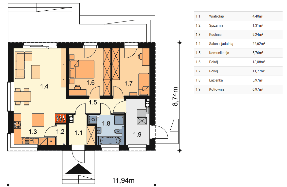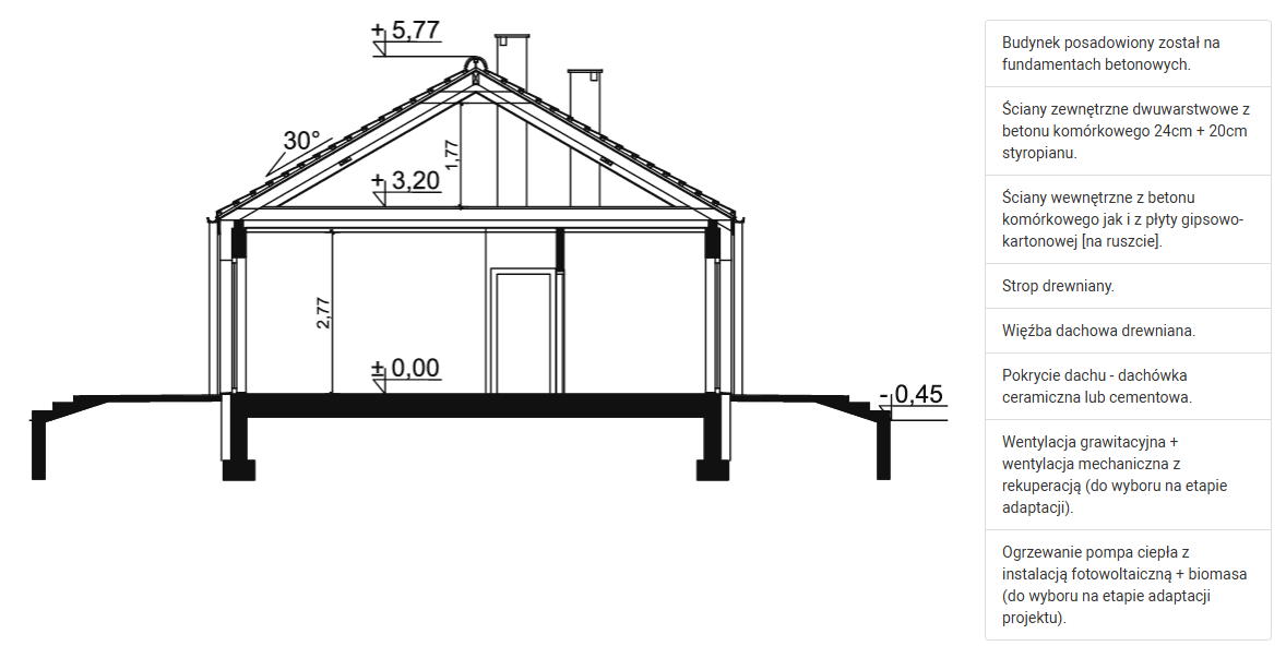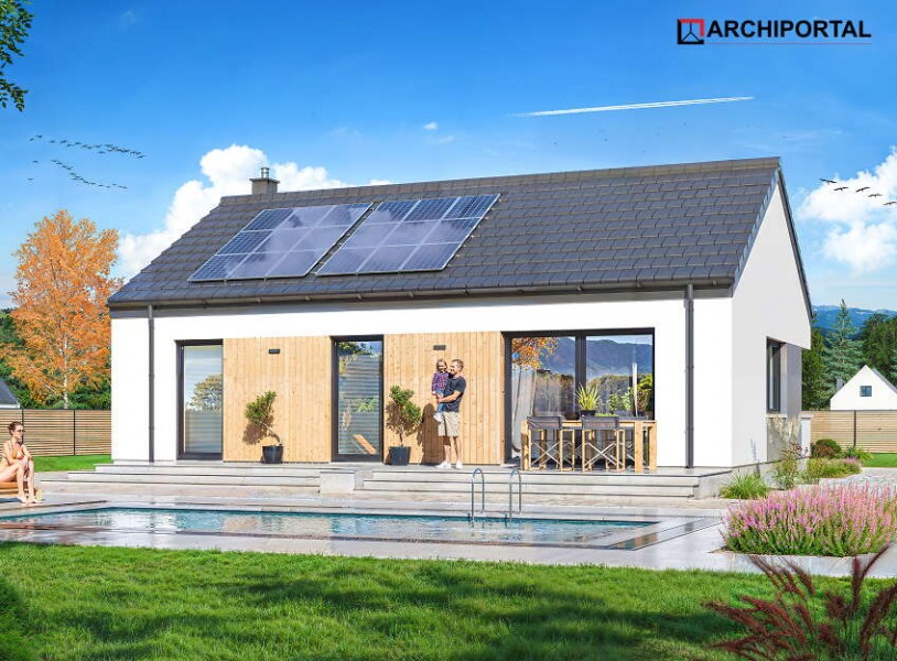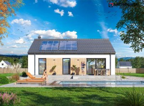 Nowoczesny dom parterowy z dachem dwuspadowym bez okapów, który wyróżnia się przemyślanym układem wnętrz, zapewniającym maksymalny komfort i wygodę życia. Dzięki optymalnej organizacji przestrzeni w budynku zmieściły się: duży salon z otwartą kuchnią i praktyczną spiżarnia, dwa ustawne pokoje, łazienka z miejscem na wannę i prysznic, kotłownia i wiatrołap. W kotłowni z bezpośrednim wyjściem na zewnątrz zaprojektowano dwa rodzaje ogrzewania na paliwo stałe - BIOMASĘ oraz przy pomocy POMPY CIEPŁA. Inwestor ma w ten sposób wybór i może zdecydować, które ogrzewania zastosować w swoim domu. Pakiet z pompą ciepła zawiera dodatkowo projekt ogrzewania podłogowego oraz projekt instalacji fotowoltaicznej. W budynku zaprojektowano także schody opuszczane, prowadzące na niewielki stryszek, który może posłużyć za dodatkową przestrzeń do przechowywania. Nieskomplikowana bryła oraz prosta konstrukcja dachu i stropu wpłyną niewątpliwie na niskie koszty budowy oraz późniejszej eksploatacji. Przy projektowaniu domu TANIA 3 nie zapomnieliśmy o ekologii. Dokumentacja projektowa zawiera dodatkowo wentylację mechaniczną, a dzięki zastosowanym materiałom cały budynek ma minimalny wpływ na środowisko naturalne i spełnia wszystkie rygorystyczne wymogi współczesnego projektowania.