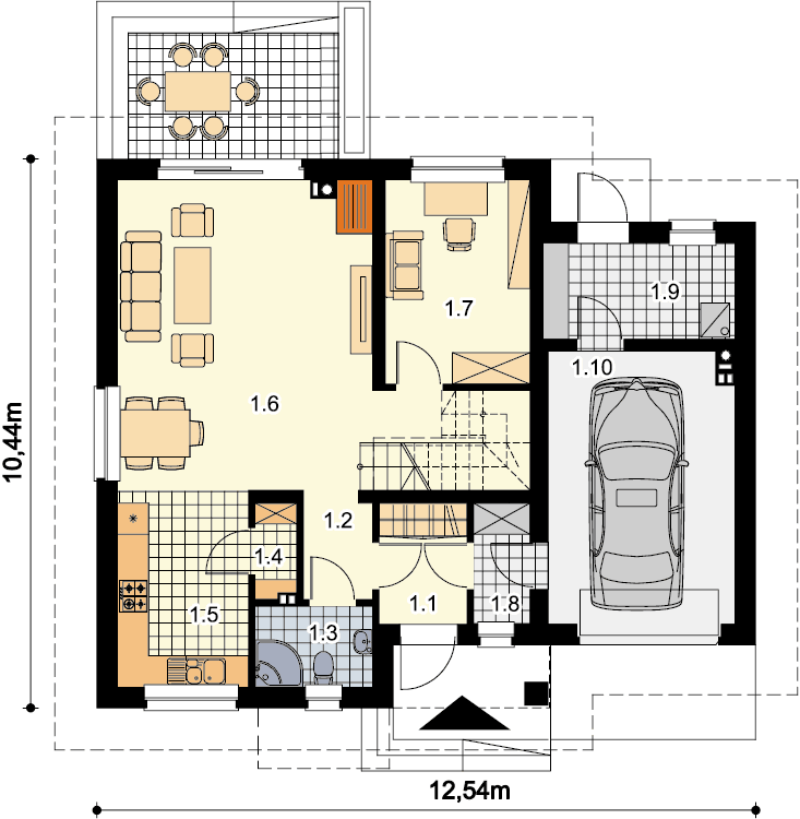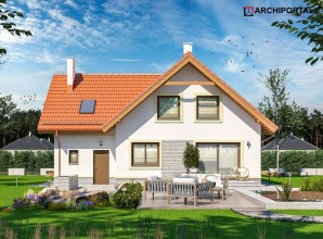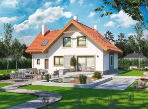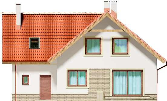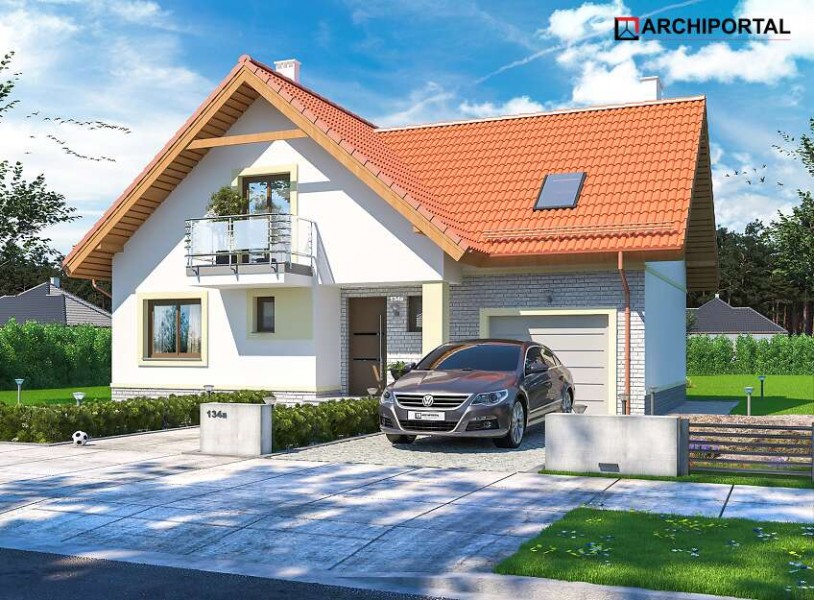 Klasyczny dom w nowoczesnej aranżacji, w którym duży nacisk położono na funkcjonalność i wygodę domowników. Do wnętrza dostajemy się przez gustowny podcień wejściowy oraz wygodny wiatrołap z miejscem na szafę przesuwną. W ciągu dnia domownicy relaksują się w dużym, dobrze oświetlonym salonie, połączonym z otwartą kuchnią, którą w razie potrzeby można oddzielić od pokoju dziennego. Nie zapomniano również o praktycznej spiżarni, łazience i dodatkowym pokoju, który może pełnić rolę np. gabinetu. Garaż został połączony z resztą domu garderobą, za nim znajduje się duża kotłownia z bezpośrednim wyjściem na ogród. W budynku zaprojektowano dwa rodzaje ogrzewania GAZOWE oraz na PALIWO STAŁE. Przyszły inwestor zdecyduje, które z nich wykorzysta. Poddasze to typowa strefa nocna, trzy ustawne pokoje, łazienka z miejscem na wannę i prysznic oraz pralnia, którą w ramach adaptacji można zamienić np. na schowek lub garderobę. Prawdziwą zaletą domu jest jednak pomieszczenie dostępne ze spocznika schodów, zostało ono tak zaprojektowane, że jego ścianka kolankowa to prawie 140 cm, dzięki temu powierzchnia użytkowa jest bardzo duża. Pomieszczenie podzielono na dwie części, dużą wygodną garderobę, dostępną z głównej sypialni oraz strych, który może pełnić rolę dodatkowego pokoju, miejsca zabaw czy dużego schowka. Pomieszczenia te można ze sobą połączyć, tworząc jedno duże. Dom jest prosty i tani w budowie, jego elewację można wykończyć zarówno w nowoczesny jak i klasyczny sposób. Budynek zaprojektowano w oparciu o najnowsze przepisy prawa budowlanego, z dużą dbałością o jego wpływ na środowisko naturalne.
