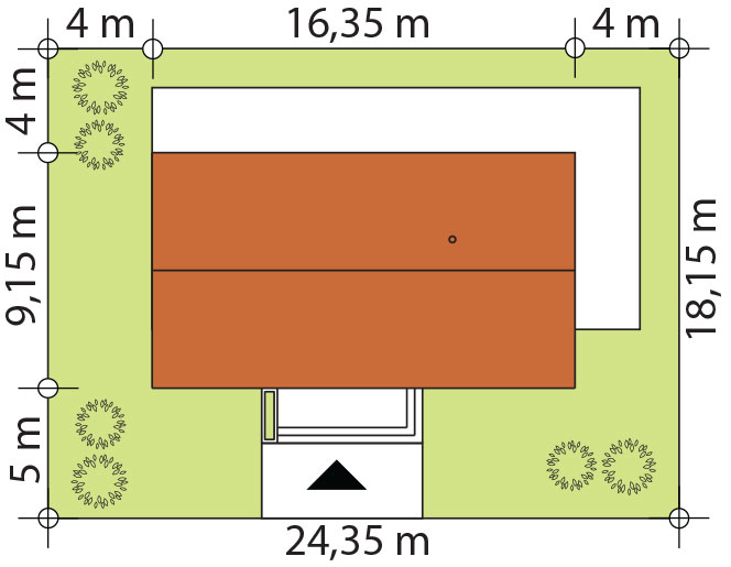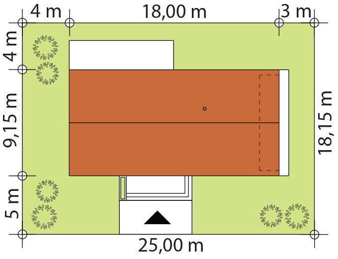 Rio — Dom parterowy (ok. 117,35 m2 powierzchni użytkowej), bez garażu, z prostą bryłą przykrytą kopertowym dachem. Salon połączony z jadalnią, kuchnia ze spiżarnią, trzy ustawne sypialnie i jedna łazienka.