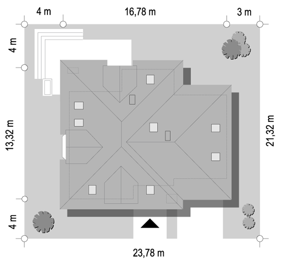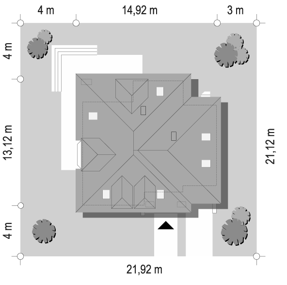 Dom typu „stodoła” z nowoczesnym zacięciem — prosta bryła z dwuspadowym dachem, bez okapów, uzupełniona o parterowe dobudówki i geometryczne naszklenia elewacji. Bryła urozmaicona jest wystającym garażem i zadaszonym wejściem, a strefa ogrodowa z tarasem podcień. Dom łączy nowoczesność z funkcjonalnością i świetnie wpisuje się w potrzeby miłośników minimalistycznej architektury.