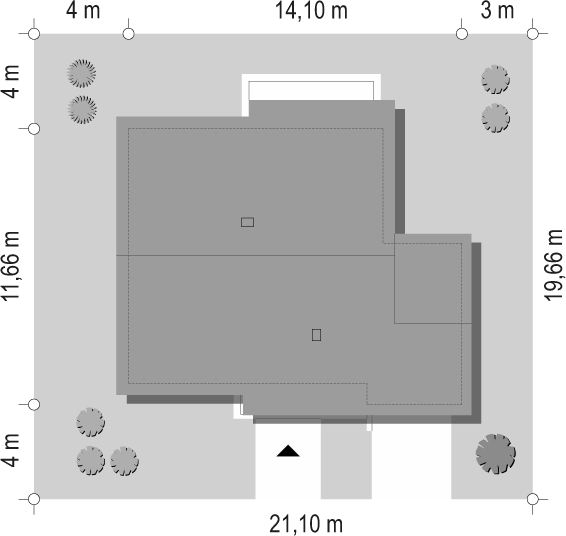 Dom typu „stodoła” z nowoczesnym zacięciem — prosta bryła z dwuspadowym dachem, bez okapów, uzupełniona o parterowe dobudówki i geometryczne naszklenia elewacji. Bryła urozmaicona jest wystającym garażem i zadaszonym wejściem, a strefa ogrodowa z tarasem podcień. Dom łączy nowoczesność z funkcjonalnością i świetnie wpisuje się w potrzeby miłośników minimalistycznej architektury.